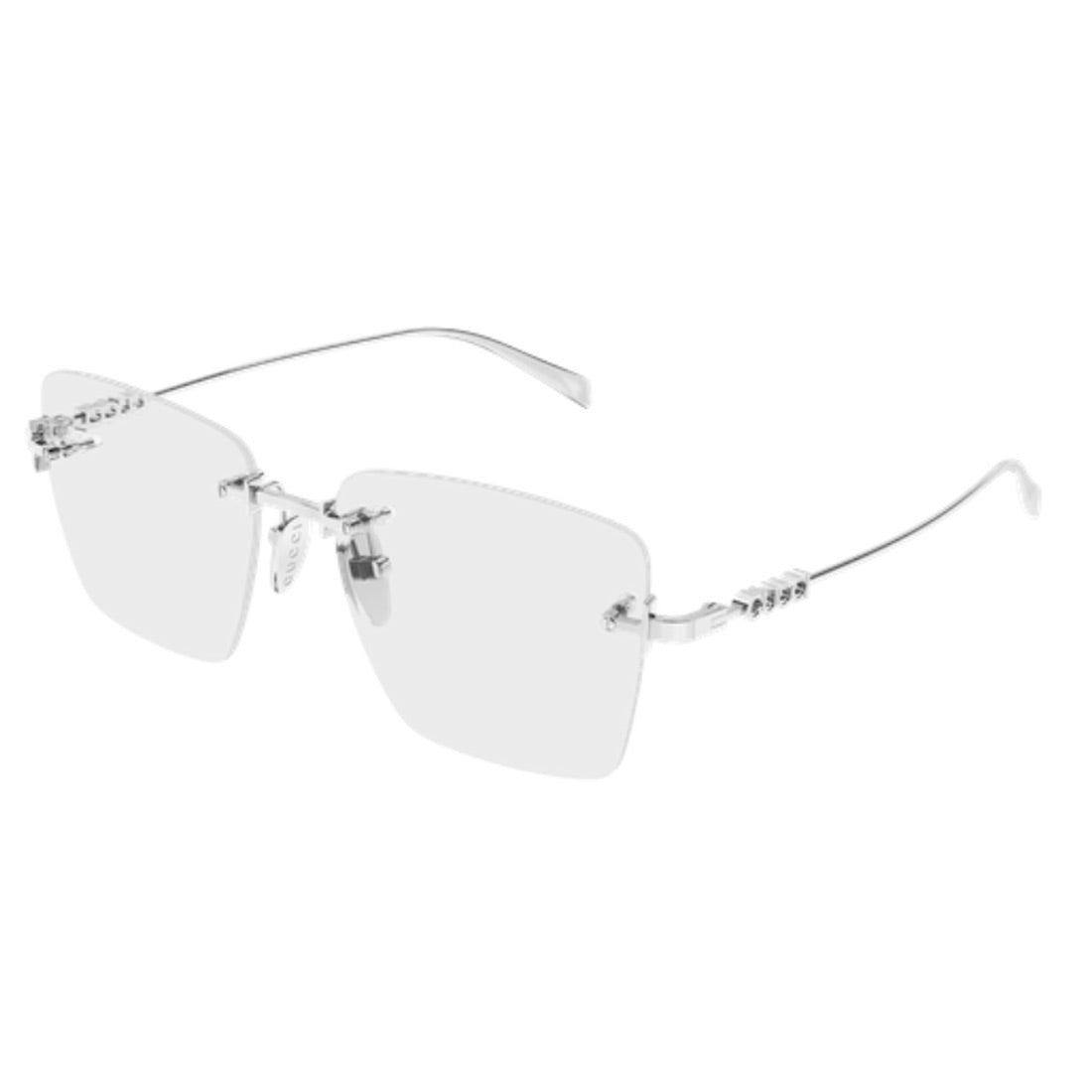 Discover the GUCCI GG1938O-002 eyeglasses, a rimless metal model with a bold and refined design. Their oversized square frame makes a powerful statement, while the openwork Gucci logo on the temples adds a distinctive touch of elegance. Available in metallic silver and gold palettes, this model embodies modern luxury and exclusivity, perfect for enhancing your everyday look.