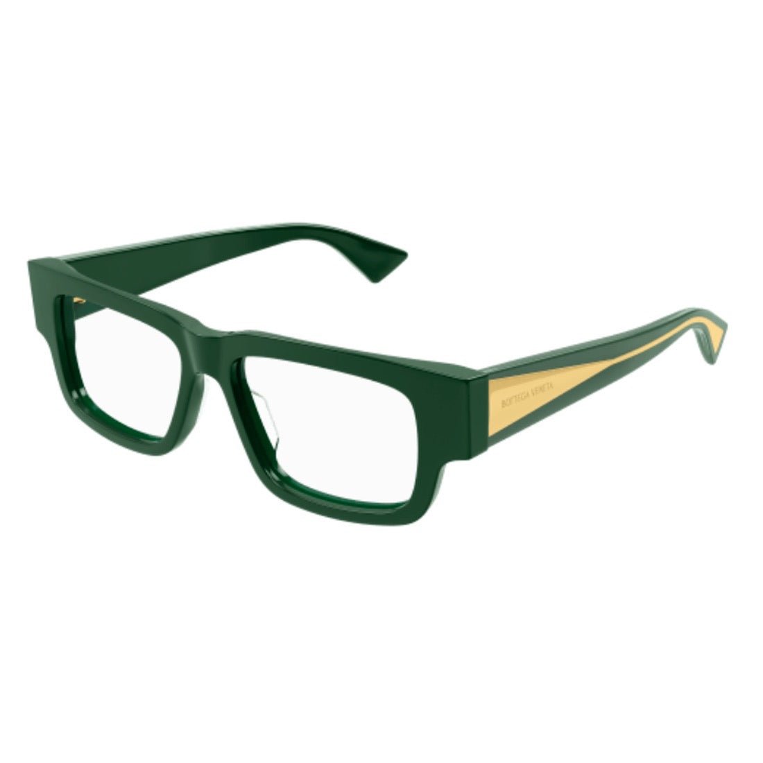 The BV1280O-003 model from BOTTEGA VENETA combines rectangular acetate design with unique temples. Their triangular metallic core decorated with the logo is revealed through the transparent resin. An easy-to-wear style for an iconic look.