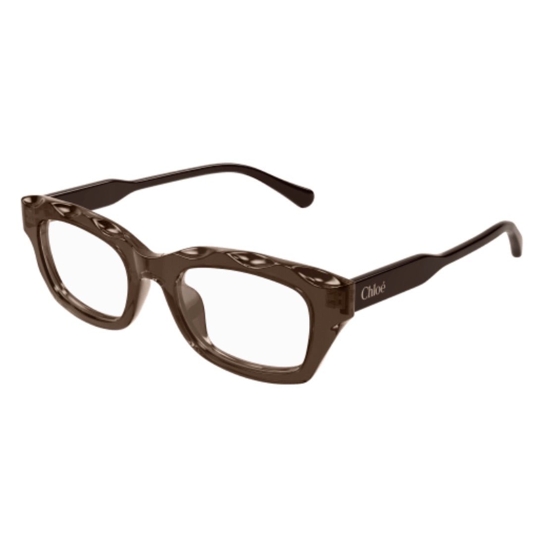 Add a touch of sophistication to your look with CHLOE - CH0297O-007. Rectangular acetate frame with a milled scalloped effect on the front. Engraved and enameled Chloé logo on the temples. Available in transparent color for an elegant look.