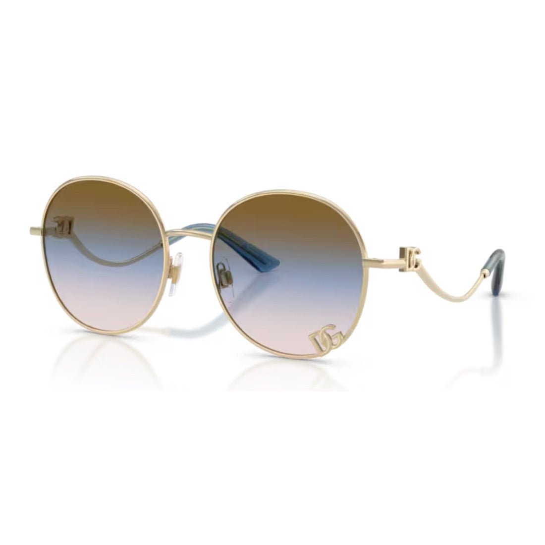 Signature DOLCE & GABBANA round sunglasses, adorned with the engraved interlocking DG logo on the left lens and the wavy temples. Acetate frame with refined tips, available in elegant metallic shades. Stylish gradient lenses for sun protection with character. An essential accessory combining iconic design and timeless sophistication.