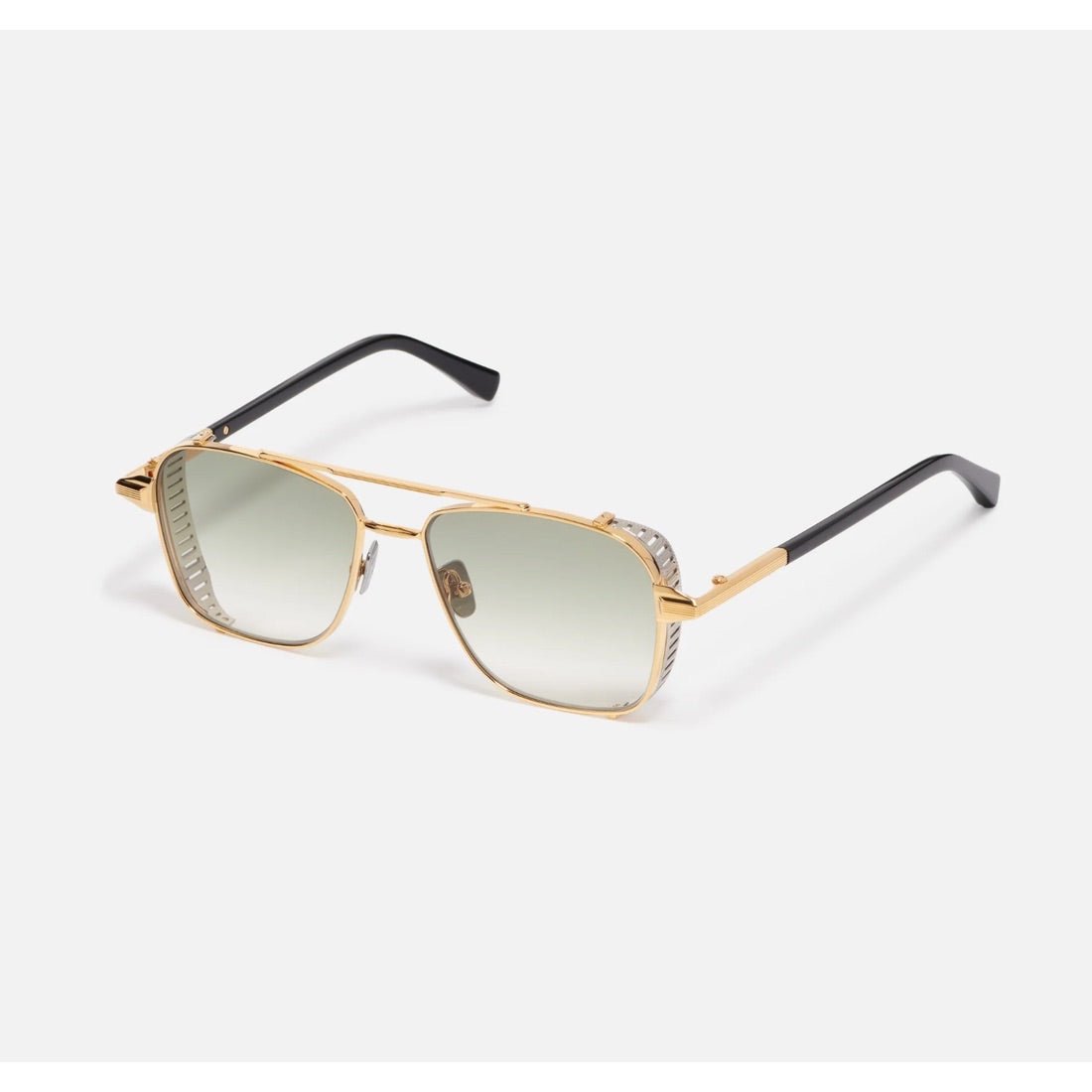 Discover the Phil aviator, an exceptional men's model by John Dalia. Its double bridge and wide, grooved temples offer a bold presence, while the glacier titanium side shields provide optimal protection. The frame is crafted from 5µ yellow gold-plated stainless steel with silver details, complemented by black acetate temple tips. The CR39 gradient gray lenses with anti-reflective coating ensure clarity and visual comfort. Comes with a case, box, and cleaning cloth.