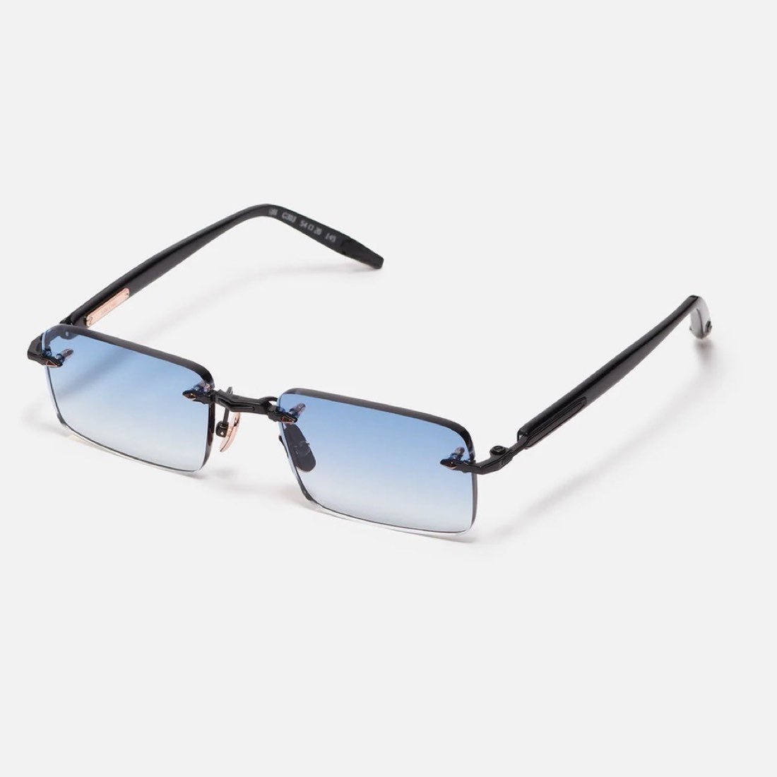 Unisex rimless rectangular frames that combine minimalism and sophistication. The wide, fluted bridge creates a distinctive presence, while the stainless steel structure features a 5µ rose gold plating (jeweler's hallmark engraved on the temple). The titanium temples offer a refined contrast, ending in carbon black acetate tips for optimal comfort. The light blue gradient nylon lenses (3.8 mm) with an internal anti-reflective coating ensure crystal-clear vision. Carrying case, presentation box, and cleaning cloth included. Color 303.