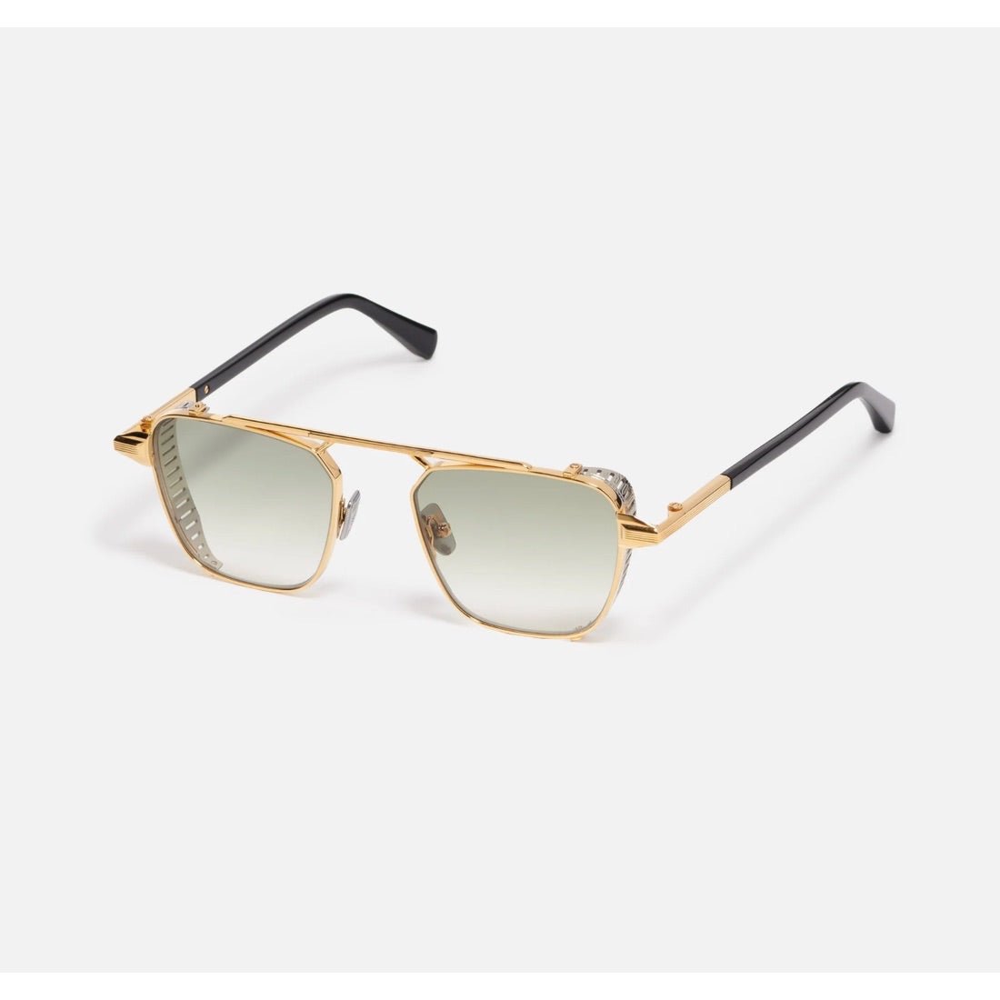 Discover the Scotty model by JOHN DALIA, unisex sunglasses with a bold square design. Featuring a yellow gold-plated stainless steel frame and light green gradient CR39 lenses with an anti-reflective coating, these sunglasses combine elegance and protection. Glacier titanium side shields, titanium nose pads, and extended black acetate temples ensure optimal comfort. Each pair bears the jeweler's hallmark on the inner temple. Delivered with a case, box, and cleaning cloth.