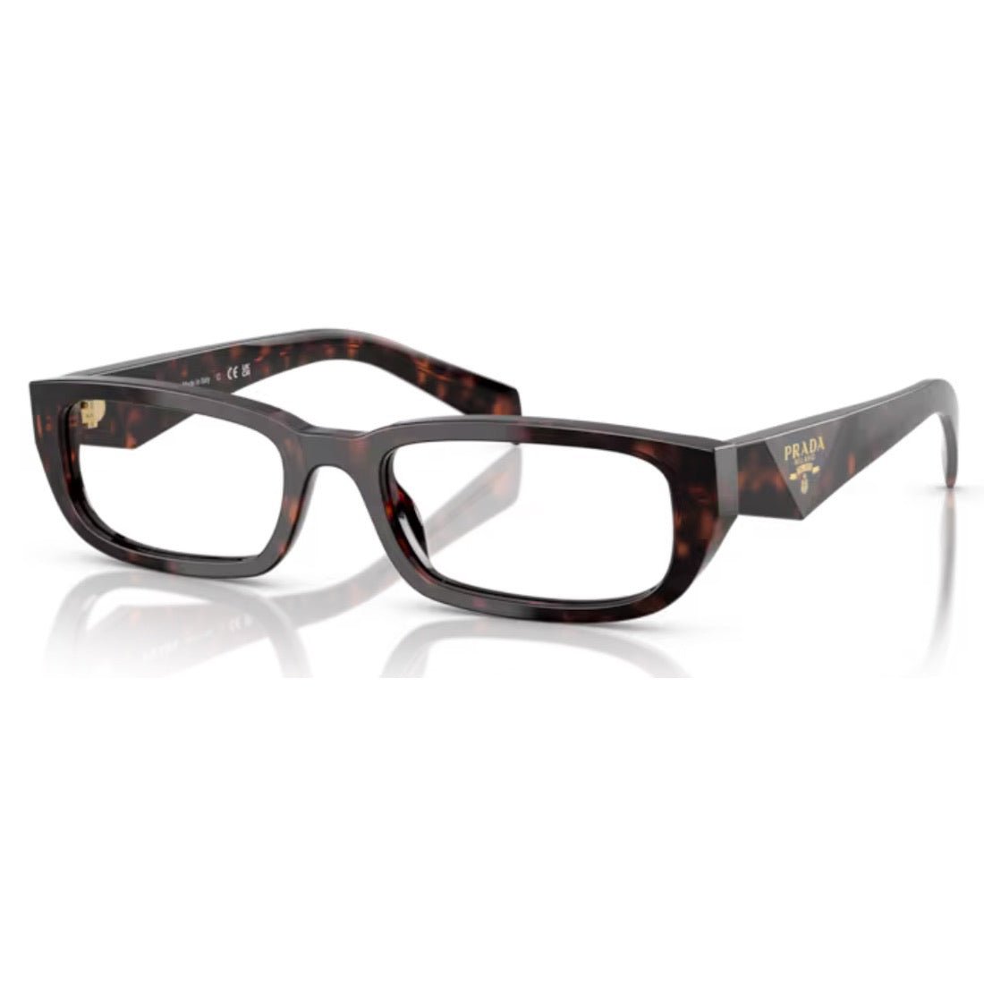 These PRADA PR B05V 17N1O1 optical glasses combine timeless elegance with modernity. Their narrow rectangular shape is enhanced by faceted temples that highlight Prada's iconic triangle, adorned with the distinctive logo. Available in transparent green, transparent peach, and tortoise with a gold logo, as well as black and transparent champagne with a silver logo, these acetate frames offer a refined and unique style with every look.