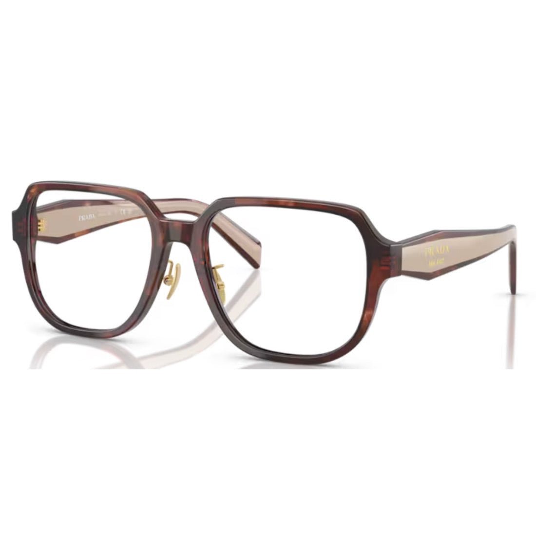 Discover contemporary elegance with the PRADA PR B07VD 07R1O1 glasses. Crafted from acetate, they combine comfort and style with their adjustable gooseneck nose pads. Their oversized frame with an Asian design offers a sophisticated silhouette, while the geometric two-tone temples highlight the Prada Milano logo, a symbol of authenticity and refinement. Perfect for asserting your personality with an avant-garde touch.